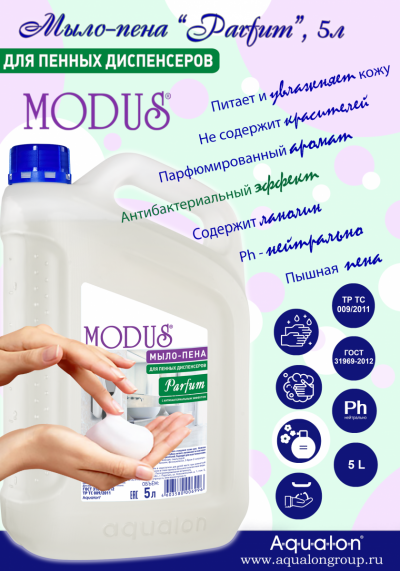 Мыло-пена MODUS Parfum предназначено для бережного очищения кожи рук. Нежная кремовая пена мягко воздействует на кожу, входящие в состав компоненты глубоко питают, увлажняют и смягчают кожу. Обладает антибактериальными свойствами! pH-нейтрально. Подходит для всех типов кожи, рекомендовано для частого применения.